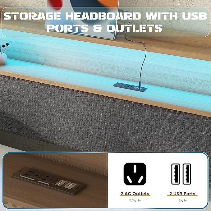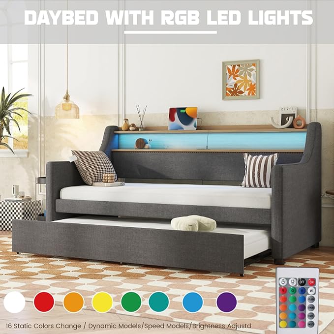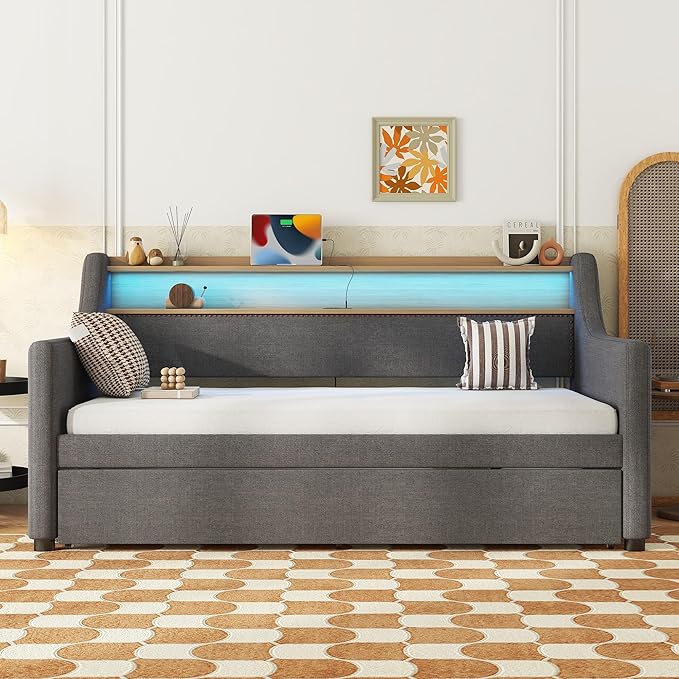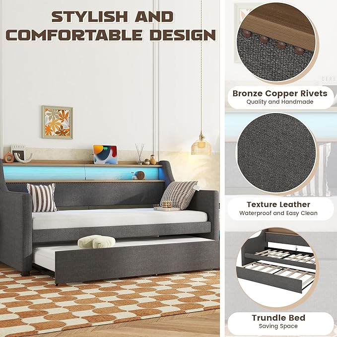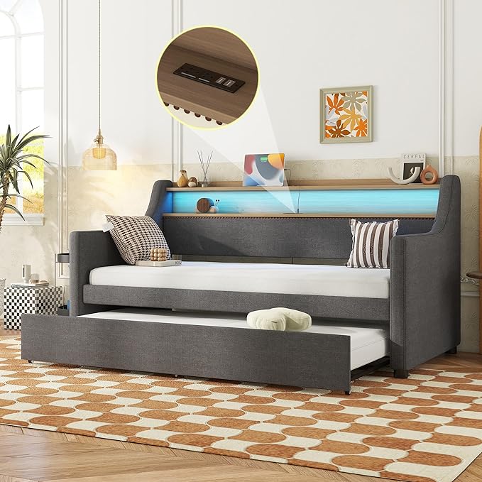 Twin Size Upholstered Daybed with Trundle, Twin Linen Sofa Bed Daybed with Charging Station and LED Lights, Day Bed Frame w/Headboard & Wood Slat Support for Bedroom, Living Room, Gray