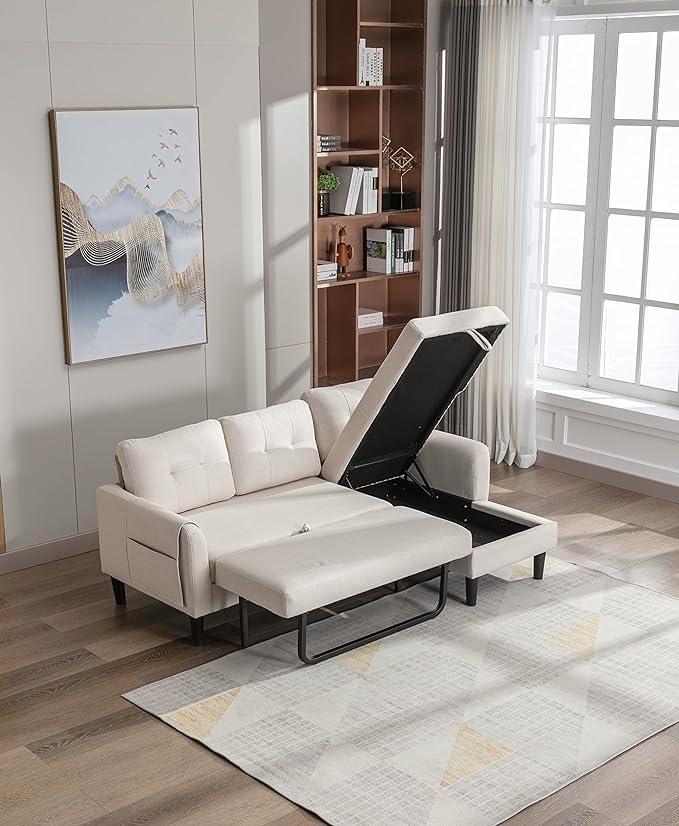 72.44" L-Shaped Reversible Sectional Sofa w/Pull Out Bed & Storage Chaise Lounge,Interior Furniture Comfy Sleeper Corner Couch with 3 Throw Pillows and Pockets,for Dorm,Apartment, Beige-1