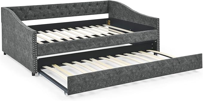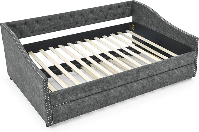 RITSU Full Size Daybed Pull Out Upholstered, with Casters,Tufted Buttons on Back, Wooden Frame Sofa Bed, Copper Nail on Waved Shape Arms, for Bedroom, Living Room, 80.50, Grey-3