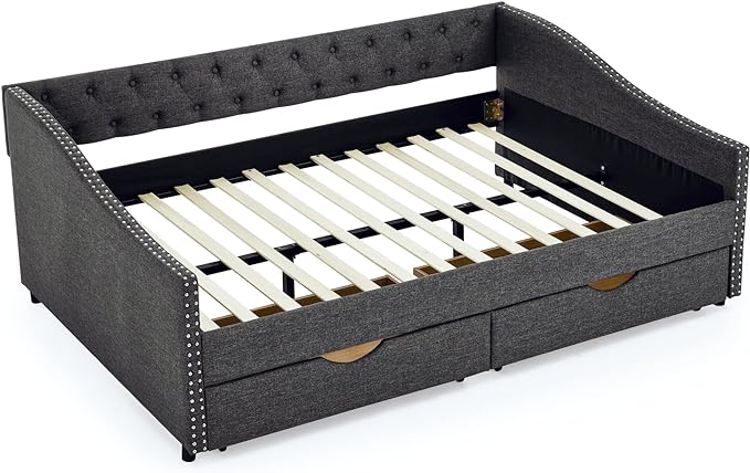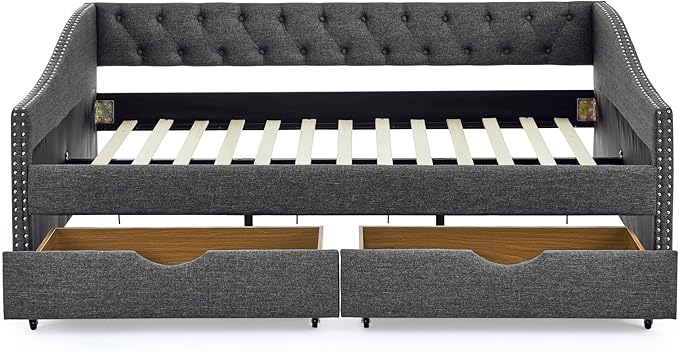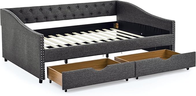 RITSU Full Size Mid-Century Daybed, 2 Storage Drawers,Linen Button Upholstered Tufted Sofa Bed, Copper Nail on Waved Shape Arms, No Box Spring Needed,for Bedroom, Livingroom, 80.50, Dark Grey-2