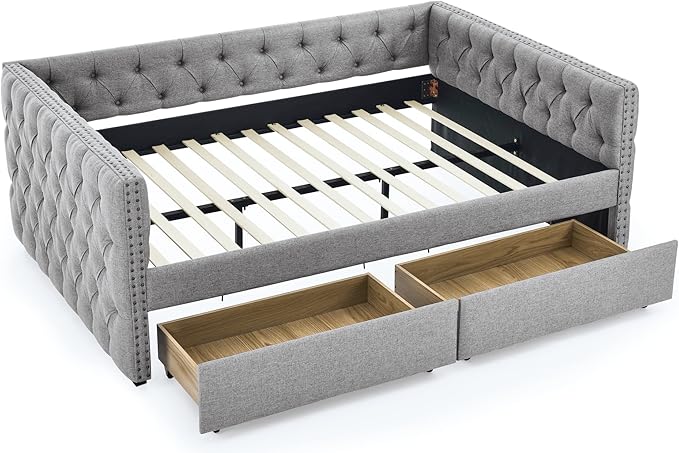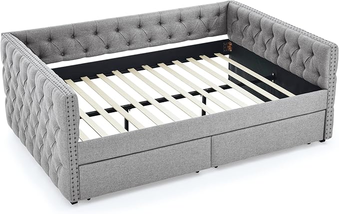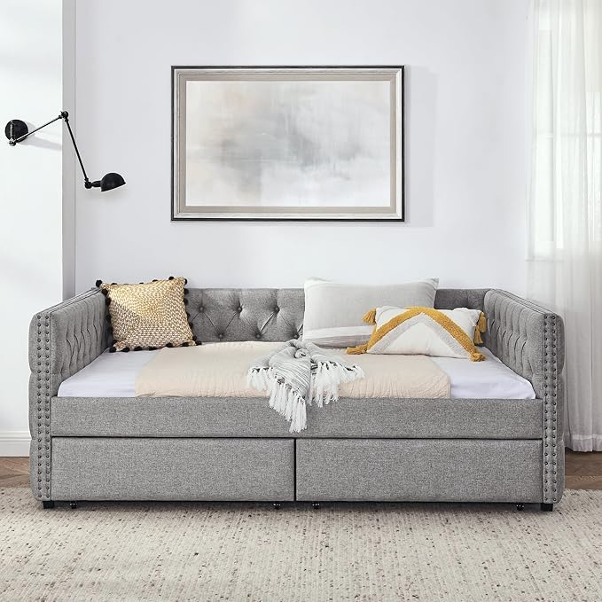RITSU Full Size Upholstered Daybed, Pull Out with Two Storage Drawers, Solid Wood Frame Sofa Bed, Tufted Buttons and Copper Nails On Square Arms, for Bedrooms, Apartments, 82.75, Grey-2