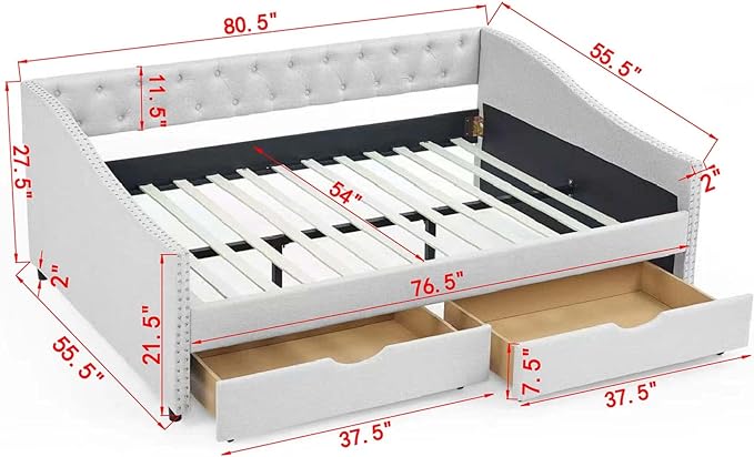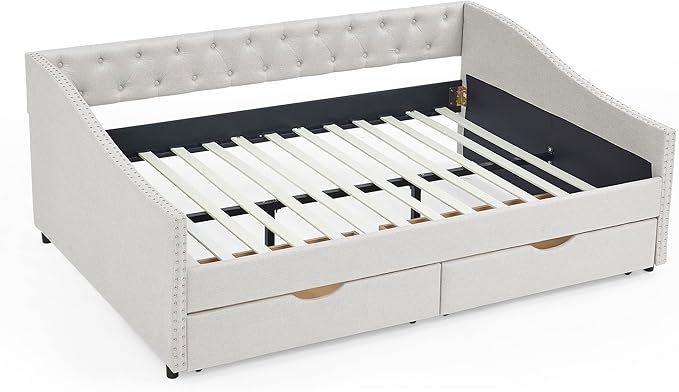 RITSU Modern Full Size Daybed with Drawers Upholstered Sofa Bed, Tufted Buttons On Back, Wooden Frame, Copper Nail On Waved Shape Arms, for Bedroom, Living Room, 80.50, Beige-1