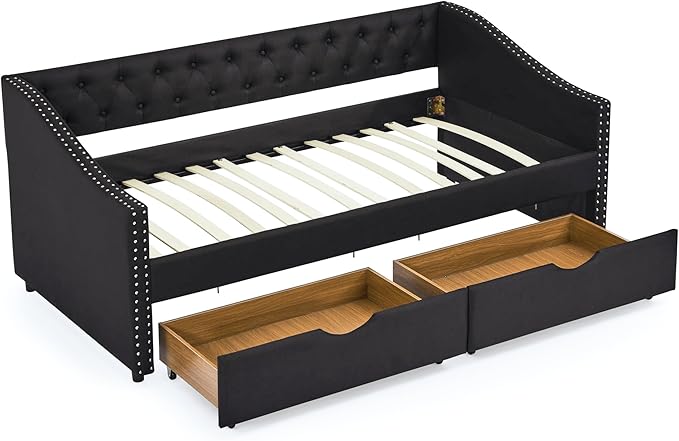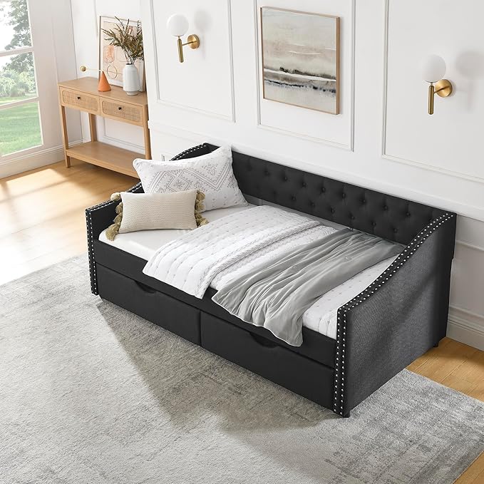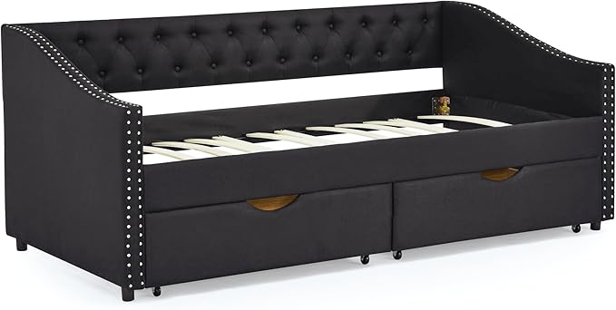 RITSU Twin Size Mid-Century Daybed, 2 Storage Drawers,Linen Button Upholstered Tufted Sofa Bed, Copper Nail on Waved Shape Arms, No Box Spring Needed,for Bedroom, Livingroom, Black, 81.50