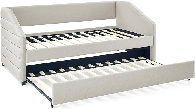 RITSU Twin Size Modern Daybed on Casters, Pull-Out Upholstered Tufted Sofa Bed, Linen Fabric & Plywood Frame, No Box Spring Required, Suitable for Bedrooms, Apartments, 82.50, Beige-3
