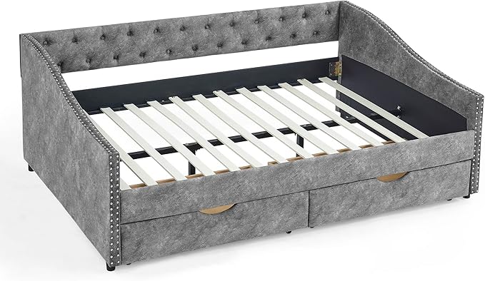 RITSU Modern Full Size Daybed with Drawers Upholstered Sofa Bed, Tufted Buttons On Back, Wooden Frame, Copper Nail On Waved Shape Arms, for Bedroom, Living Room, 80.50, Grey-1