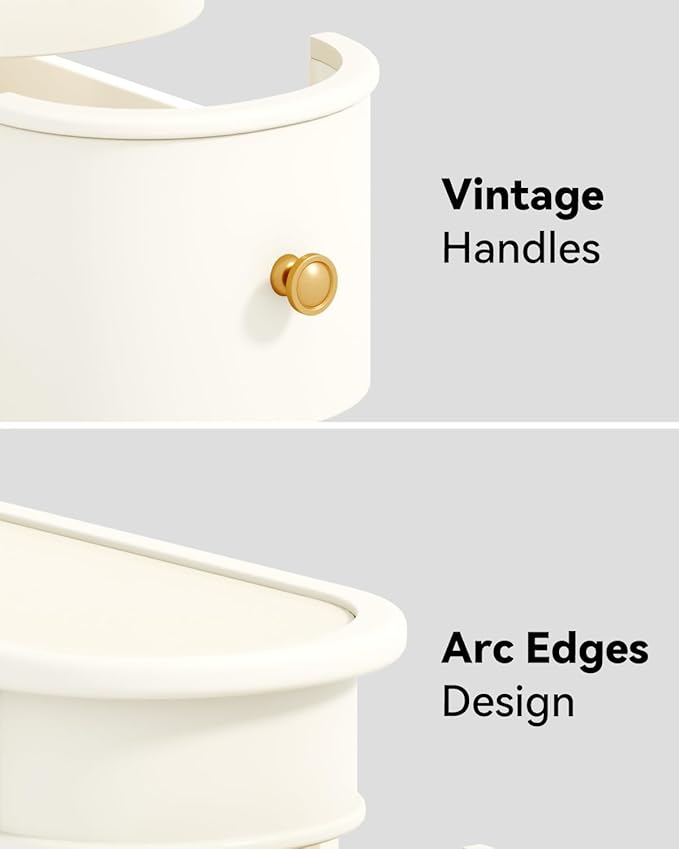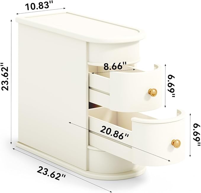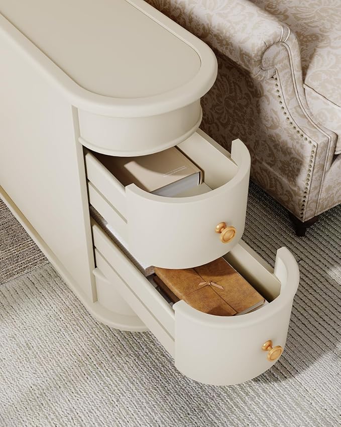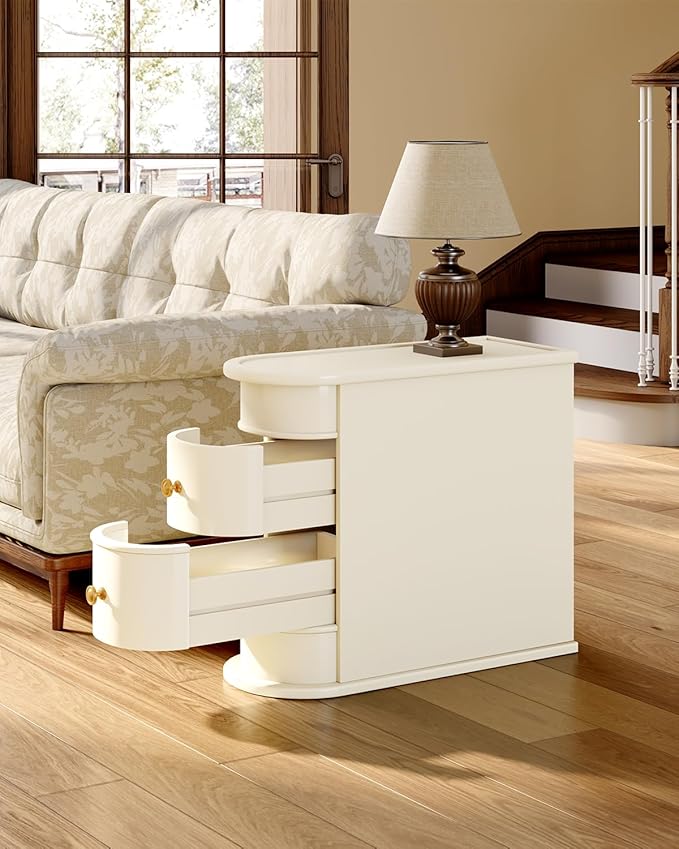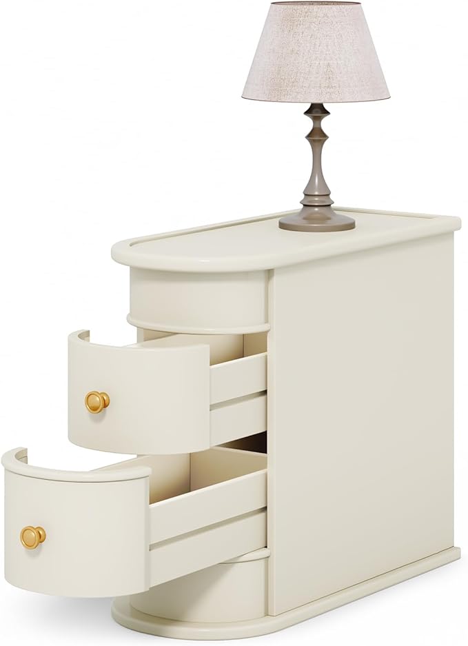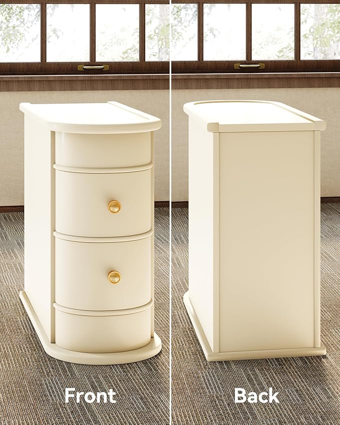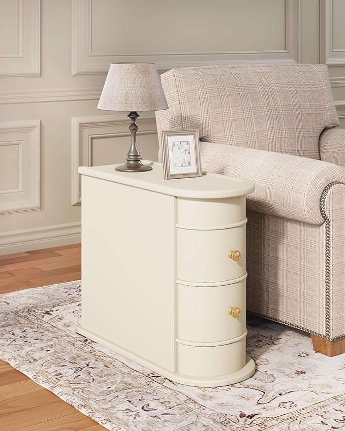End Table, Off-White Wooden Side Table with 2 Drawers, No Assembly Required Sofa Side Table, Closed Back, Vintage Slim Nightstand Bedside Table for Bedroom