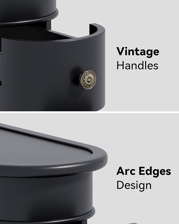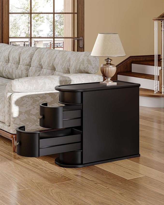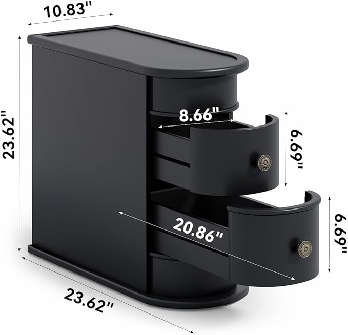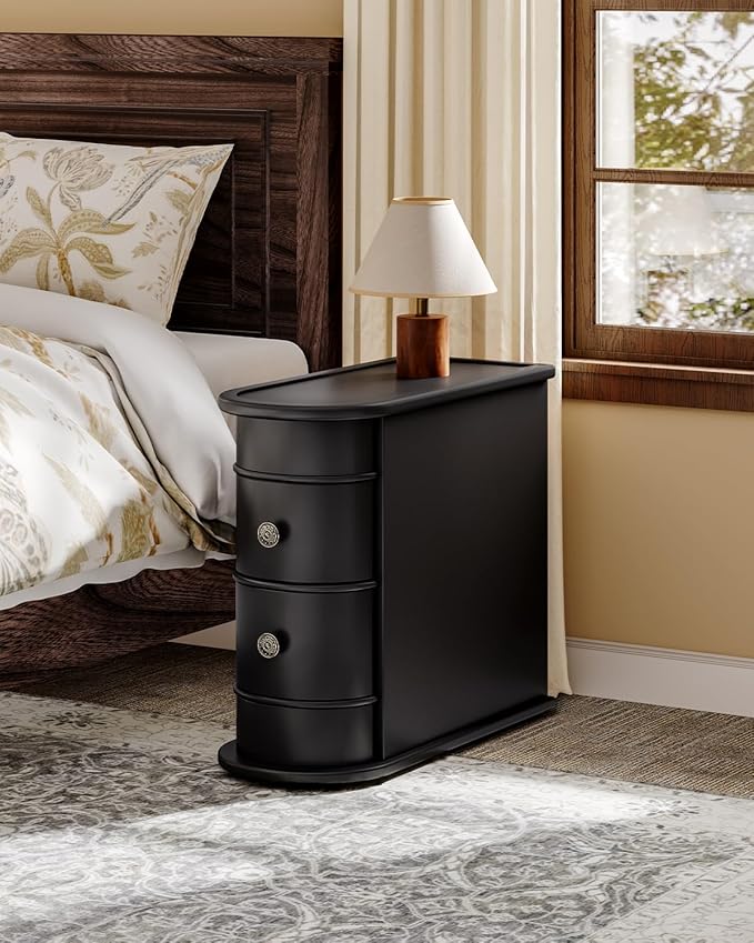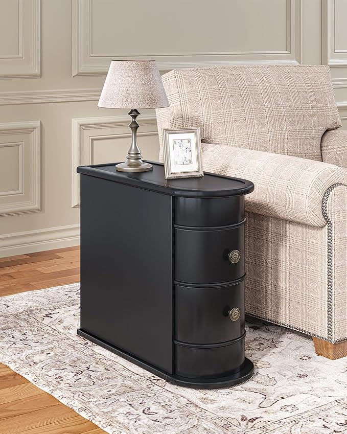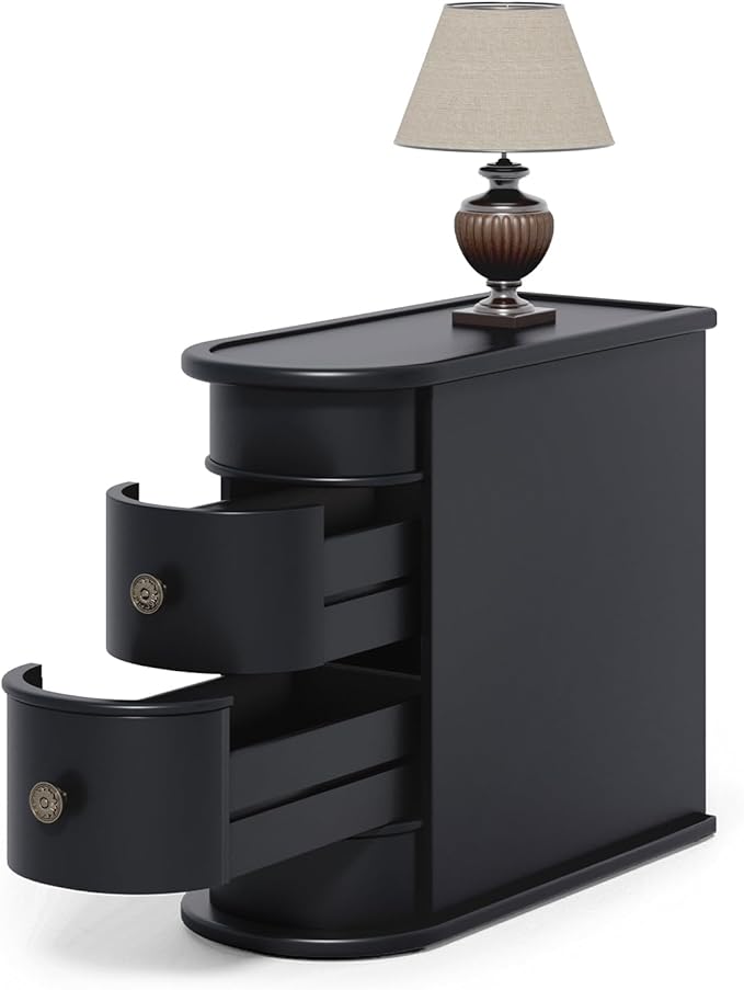 End Table, Black Wooden Side Table with 2 Drawers, No Assembly Required Sofa Side Table, Closed Back, Vintage Slim Nightstand Bedside Table for Bedroom