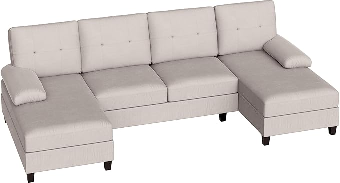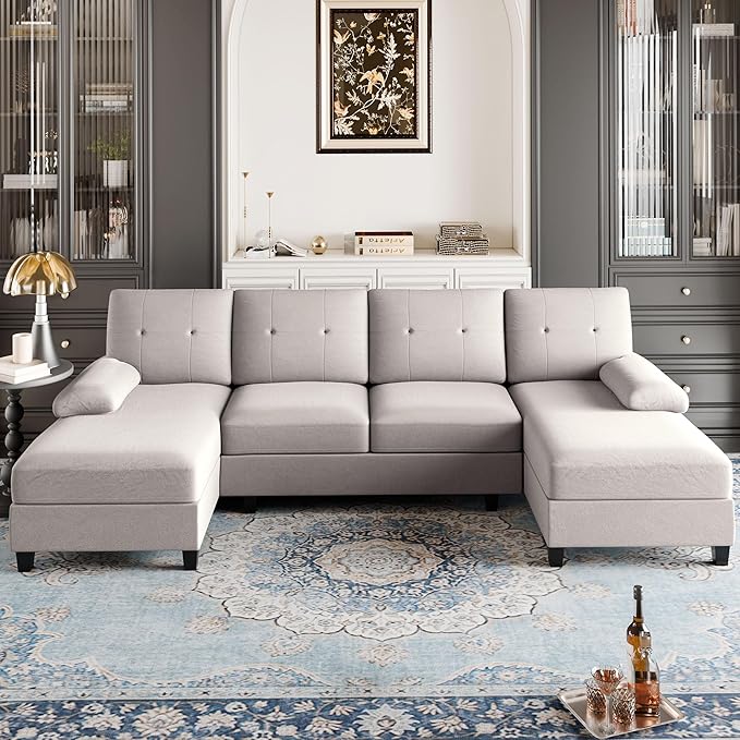 Shintenchi Sectional Couches for Living Room, U Shaped Sofa Couch with Double Chaise, 4-Seat Living Room Furniture Sets with Soft Cushion & Linen Fabric, Creamy White