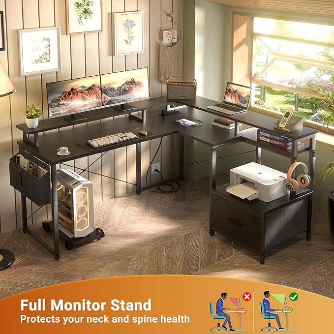Unikito L Shaped Desk with File Drawer, Reversible L Shaped Computer Desk with Power Outlet & LED Lights, Home Office Desk Corner Desk with Monitor Shelf and Printer Cabinet, Gaming Desk, Black