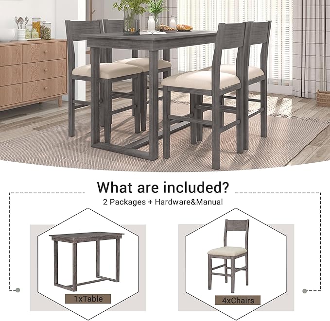 5 Piece Farmhouse Counter Height Dining, Wooden Set with 1 Rectangular Table and 4 Upholstered Chairs for Small Spaces Eat-in Kitchen, Gray