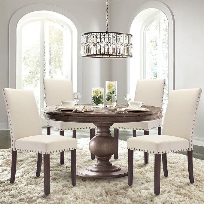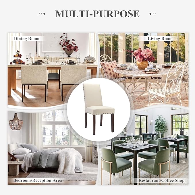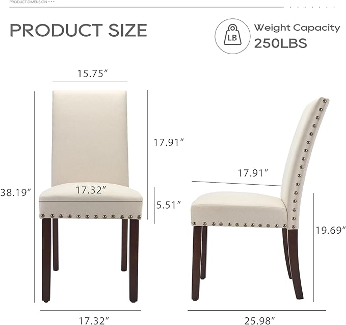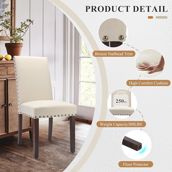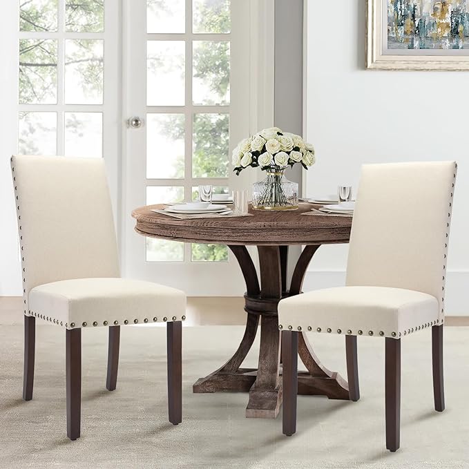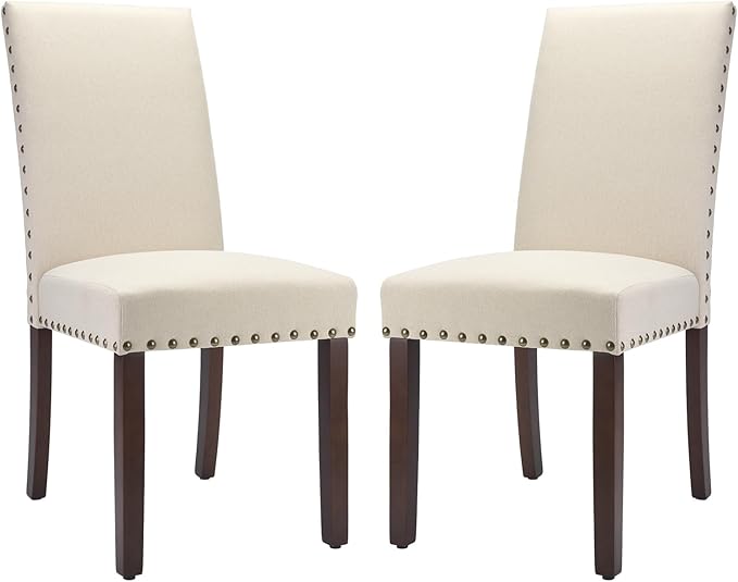 COLAMY Dining Room Chairs Set of 2, Parsons Kitchen Side Chiars with Padded Seat, Wood Legs, Nailed Trim, Beige