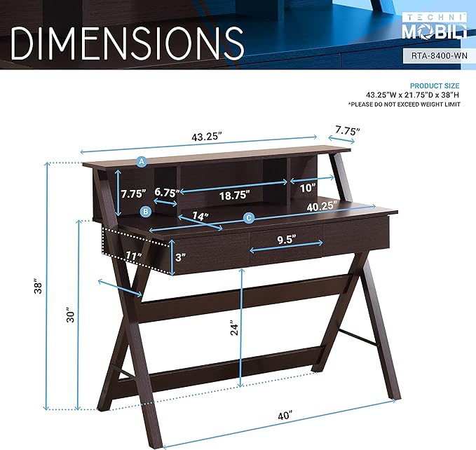 NicBex Laik-DW-00040-DX Desks, 43.25" W x 21.75" D x 38" H, Brown