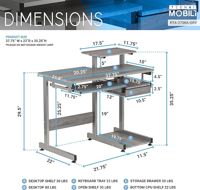 NicBex Laik-DW-00053-DX Desks, 37.75" W x 22" D x 35.25" H, Gray