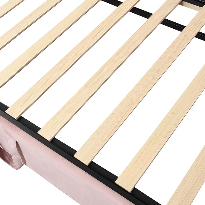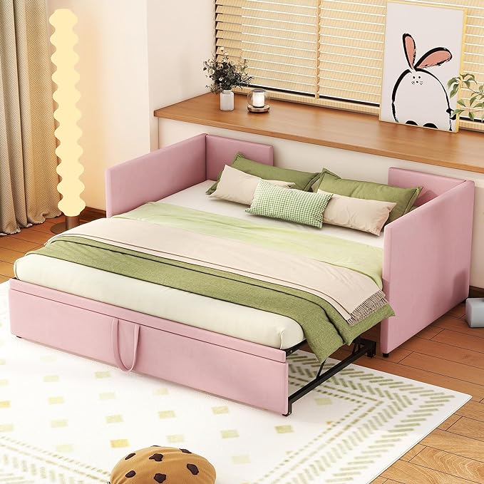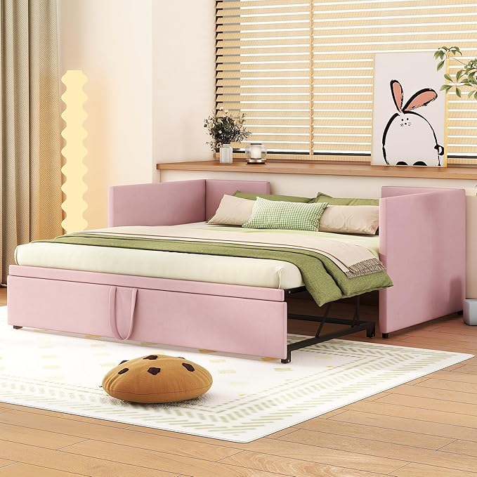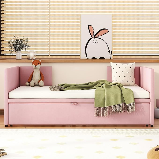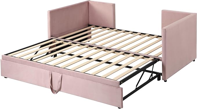 Bellemave Twin Size Upholstered Daybed with Pop up Trundle,Velvet Twin Daybed Frame,Twin to King Daybed,Day bed with Trundle Bed Twin,Tufted Sofa Bed Daybed,Bedroom,Living Room,Guest Room(Pink)