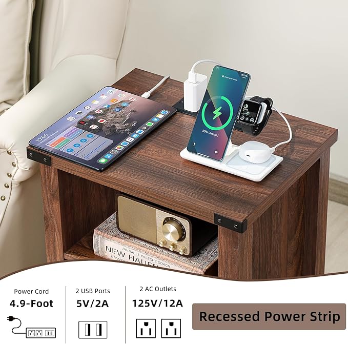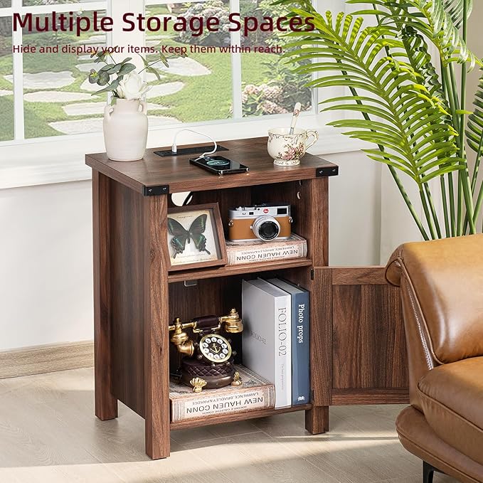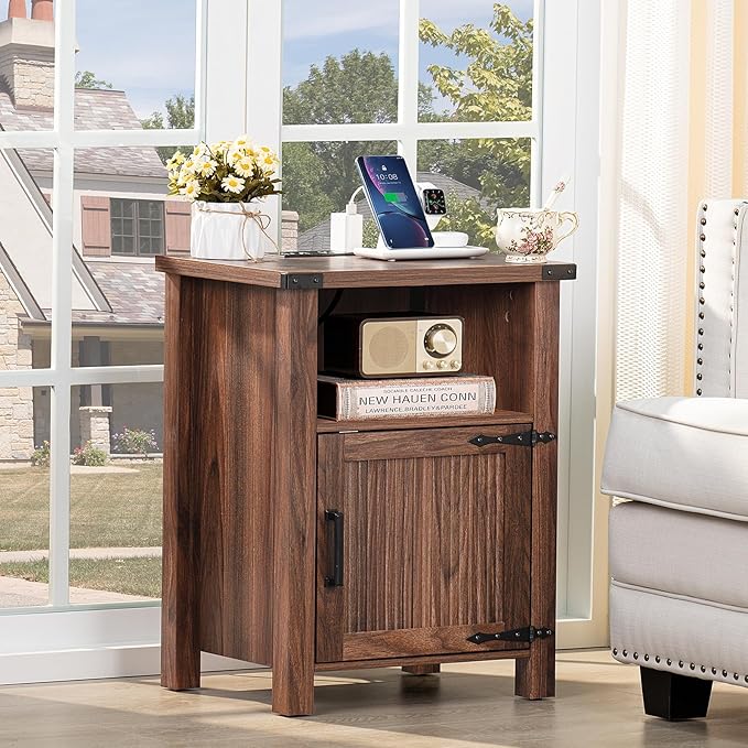 Night Stand, 18 Inch Farmhouse Nightstand with with Charging Station and USB Port, Rustic Couch End Table with Magnetic Door, Wood Bed Side Tables for Bedroom, Home, Brown Walnut