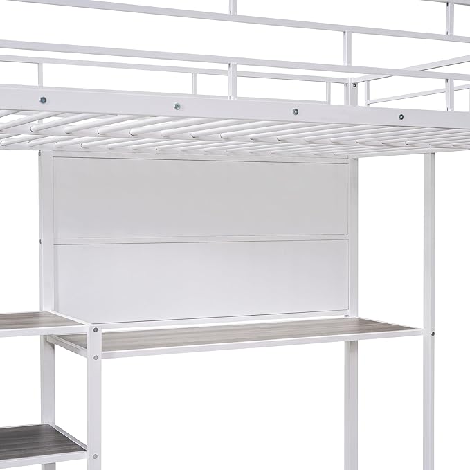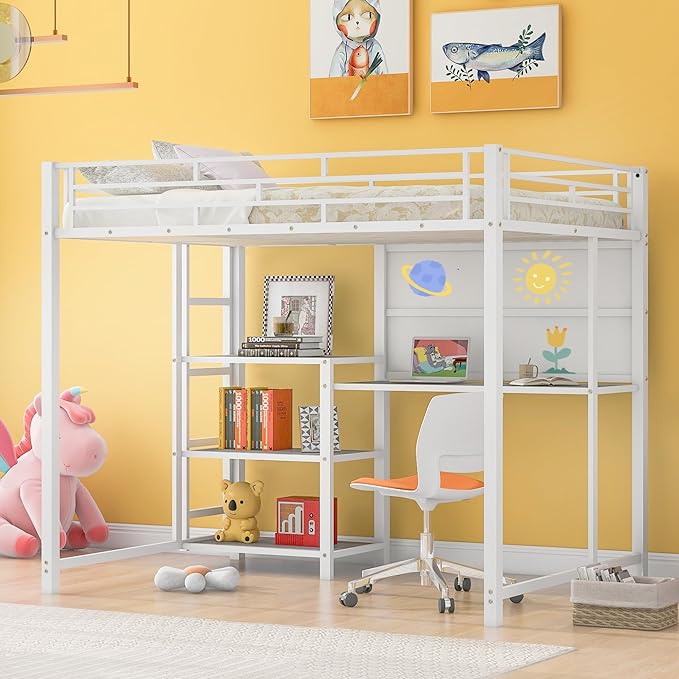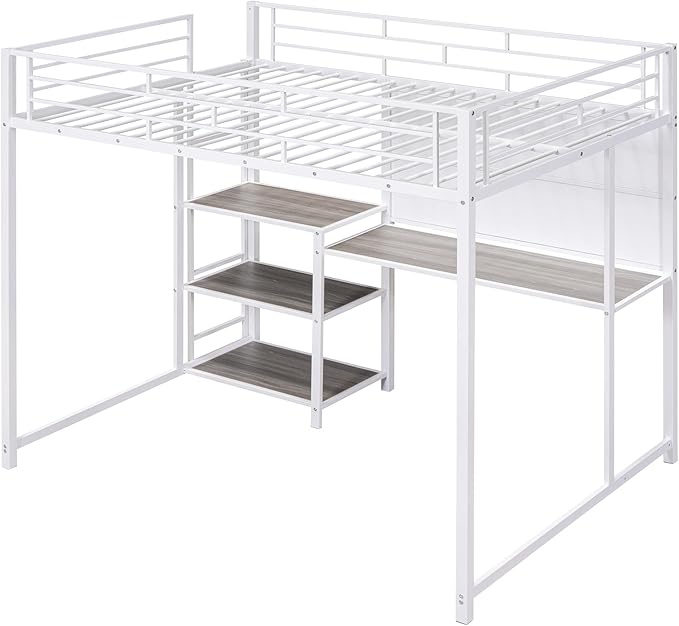 RITSU Full Size Loft Bed, Heavy Duty Metal Bunk Bedframe with Desk and Whiteboard, Safety Guardrail Fence & Ladder, 3 Big Storage Shelves, for Kids, Teens, White