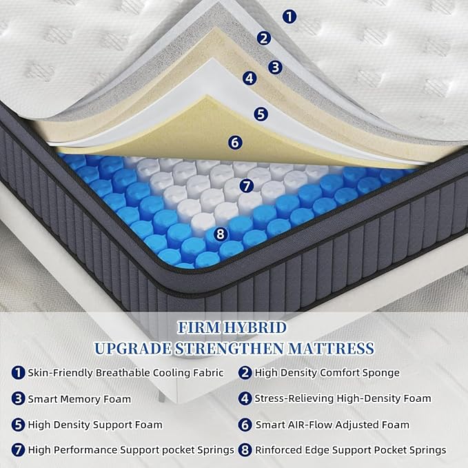 Queen Mattress - Upgrade Strengthen - 14 Inch Firm Hybrid Queen Size Mattresses in a Box, Mattress Queen Size With Memory Foam and Independent Pocket Springs, Strong Edge Support, Release Pressure