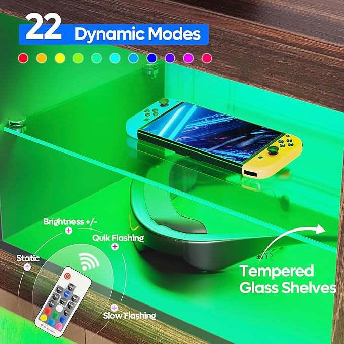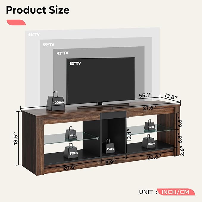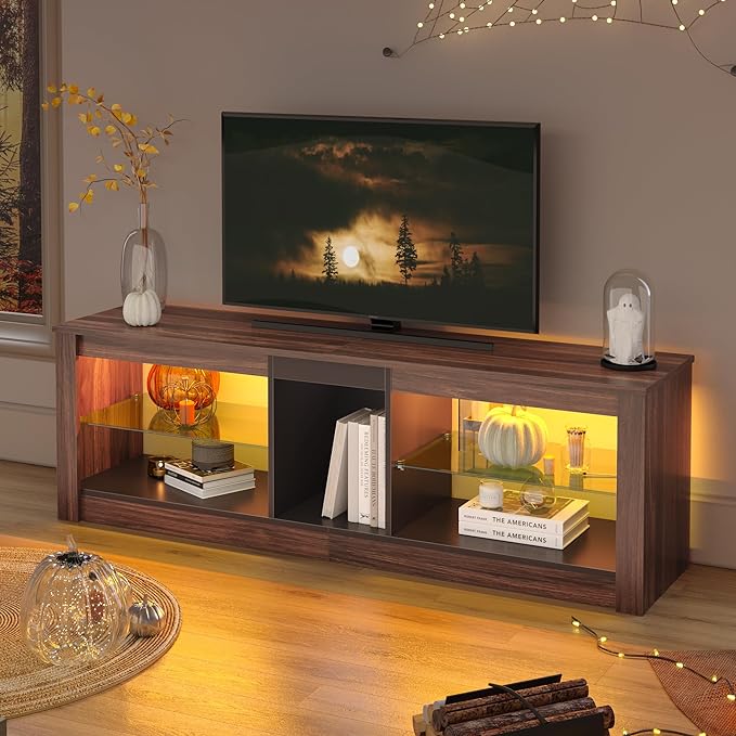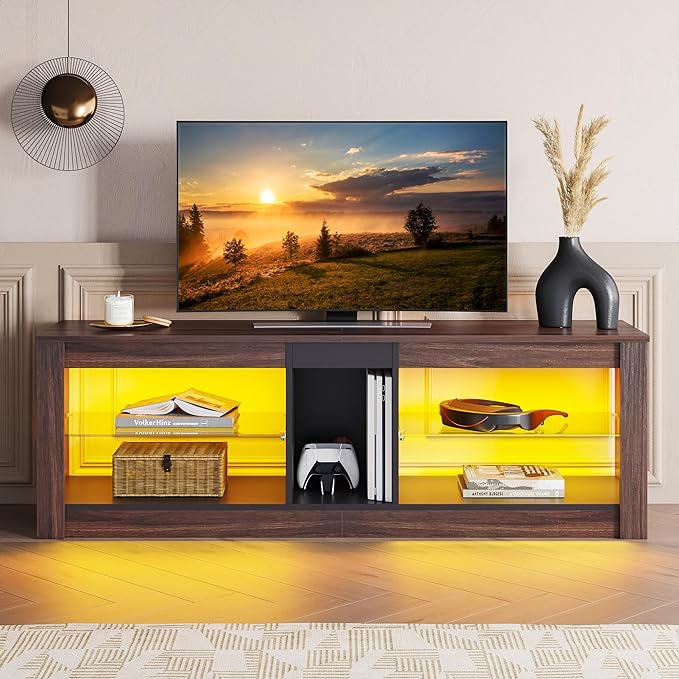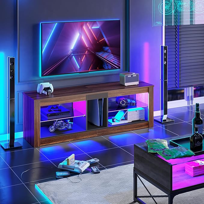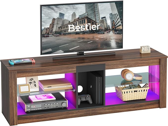 Bestier 55 Inch TV Stand with LED light, Adjustable Glass Shelves, 22 Dynamic RGB Colors, P2 Particle Board, for Entertainment Center, Living Room, Gaming Room, and Bedroom, Dark Walnut
