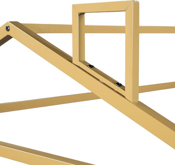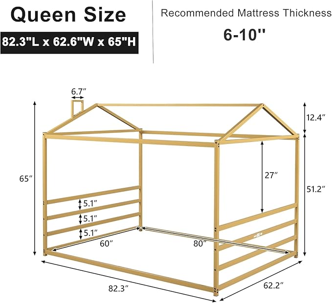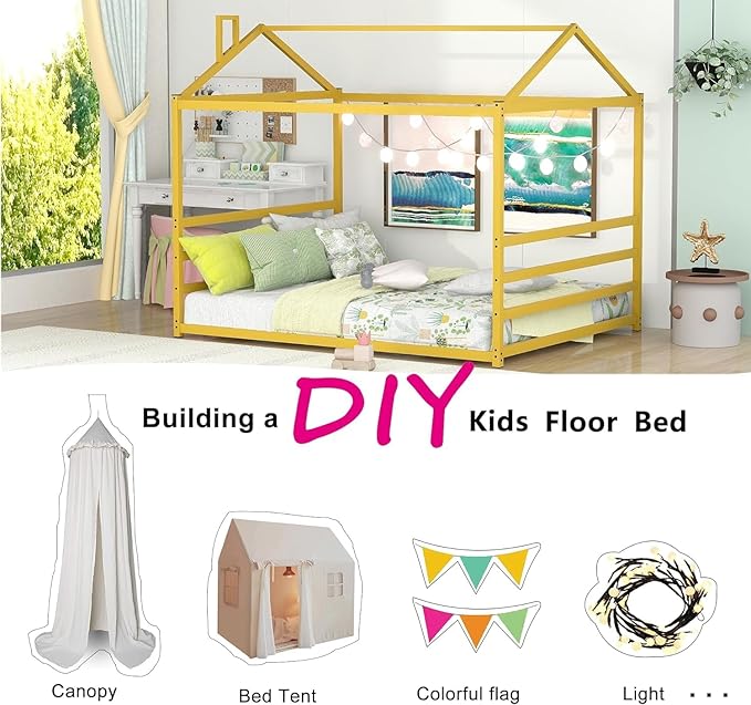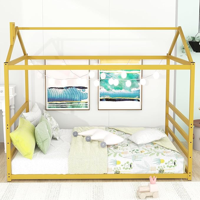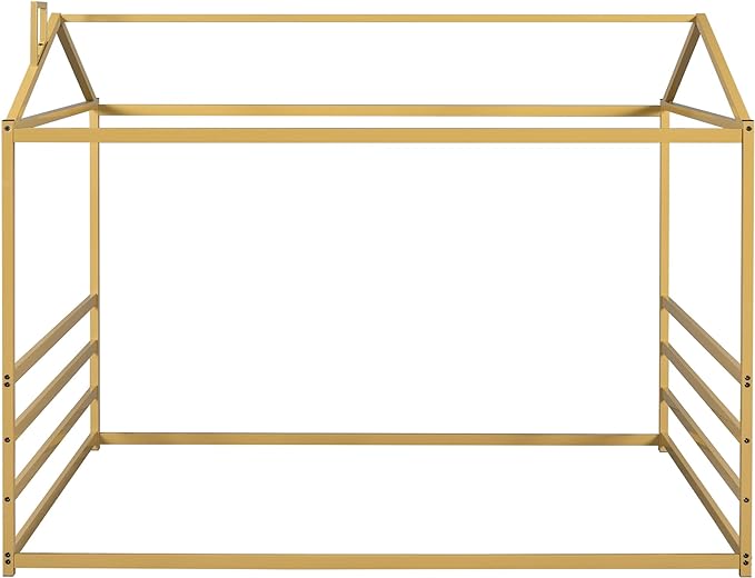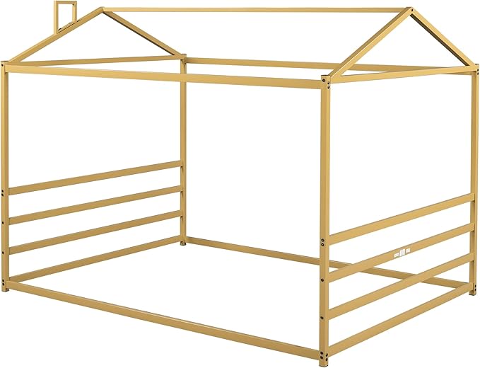 Queen Size Metal Floor Bed for Kids,Montessori Floor Bed with Roof,House Bed Frame for Boys Girls,Metal House Shape Platform Bed,Gold