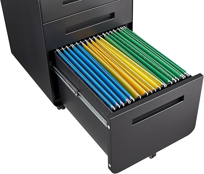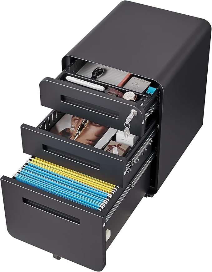 3 Drawer Mobile Desk Office with Lock and Wheels,Versatile Storage Cabinets w/Anti-Tilting Cold Rolled Steel Waterproof Moisture-Proof,for Legal/Letter/A4 Files,Black
