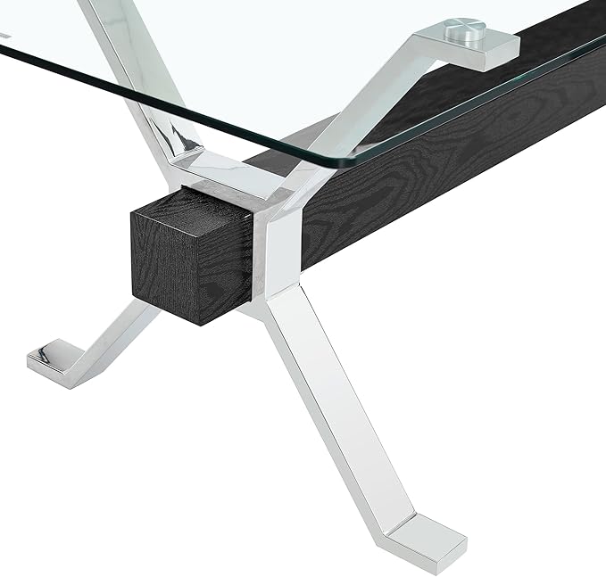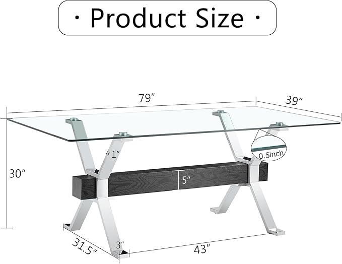 Rectangular Table with Tempered Glass Tabletop,Modern Dinner Desk W/Metal Tubular Legs, Home,Kitchen,Dining Room,Office,Silver, 79" Black Crossbars