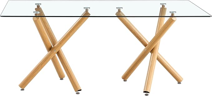 Modern Glass Table with Rectangular Tempered Tabletop,Dinner Desk Set for 6-8 people W, Home,Kitchen,Dining Room,Office,Wood+Clear Finish, 71" Chrome Metal Legs