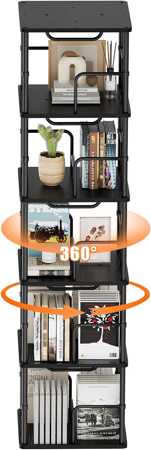 5 Tier Square Rotating Bookshelf, 360 ° Display Stackable Spinning Bookshelf Tower, Space Saving Tall Floor Standing Swivel Bookcase Corner Storage Organizer for Bedroom, Living Room, Black