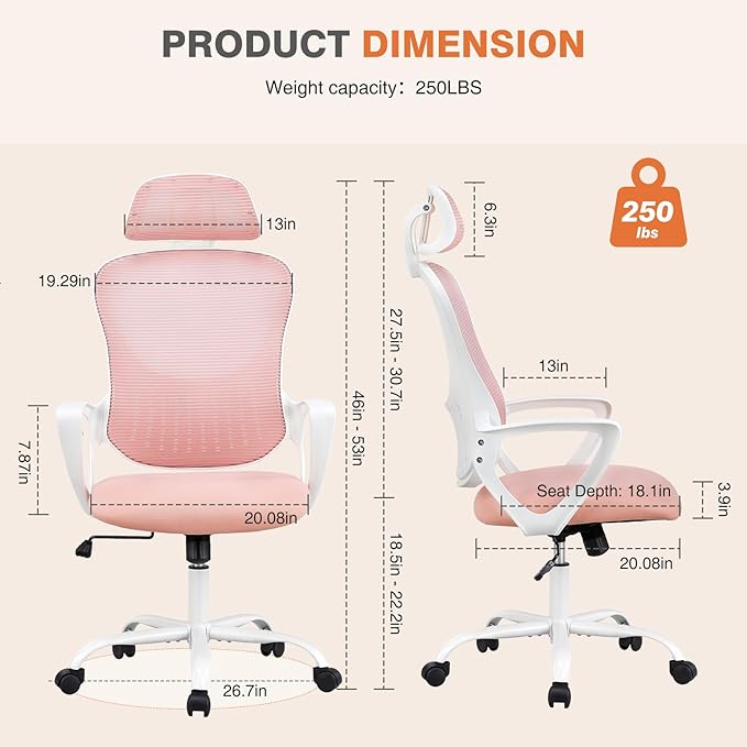 Sweetcrispy Office Computer Desk Chair, Ergonomic High-Back Mesh Rolling Work Chairs with Wheels and Adjustable Headrests, Comfortable Lumbar Support, Comfy Armrest for Home, Bedroom, Study, Pink