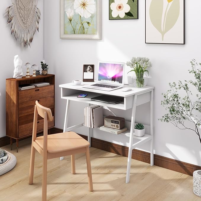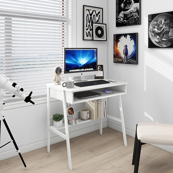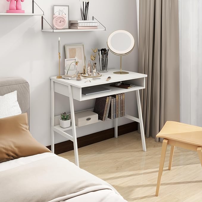 Small Computer Desk, Bureau de Travail, 31.5inch White Desk, Bureau Gaming Desk, Study Table, Sit Stand Desk with Drawers, Wood Dressing Desk with Metal Frame, for Bedroom, Livingroom, Office