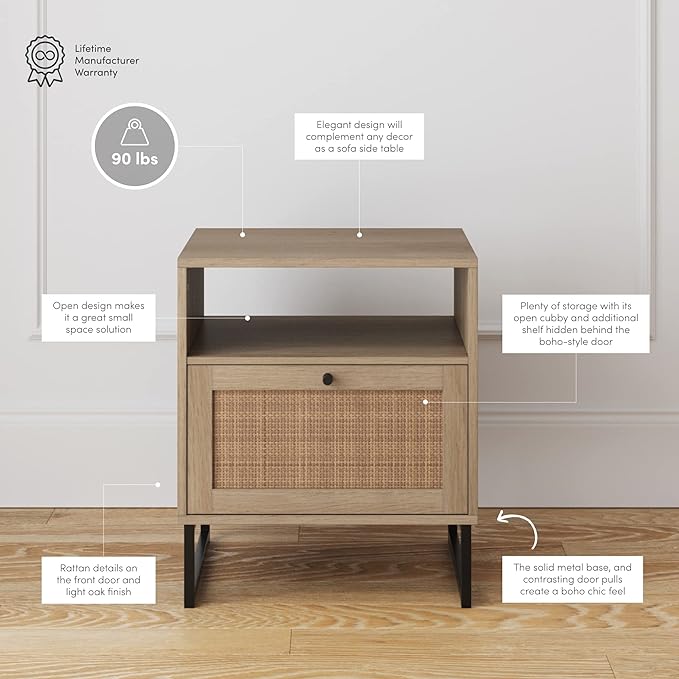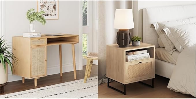 Nathan James Jacklyn Modern Home Office Writing Desk and Mina Rattan Wood End Side Accent Table Nightstand, Natural Brown and Oak/Black