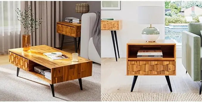 Bme Georgina Solid Wood Coffee Tables & Nightstands with Geometric Details, 2 Drawers
