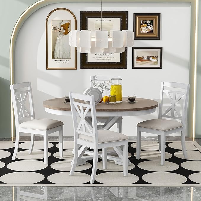 Retro Style 5 Piece Set with Extendable Round Table and 4 Upholstered Chairs, Full Assembly Required and Easy Clean, for Dining Room, Kitchen, Brown+Antique White