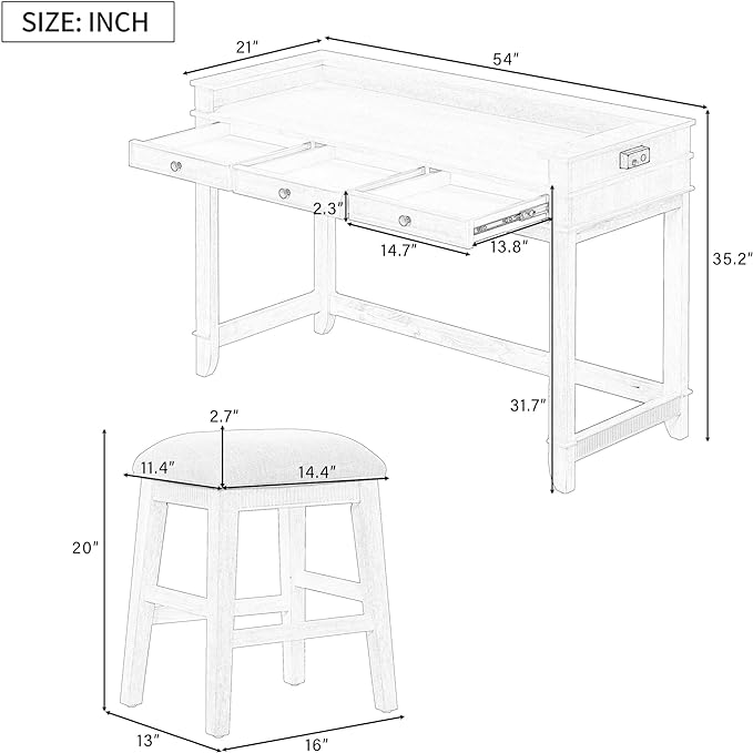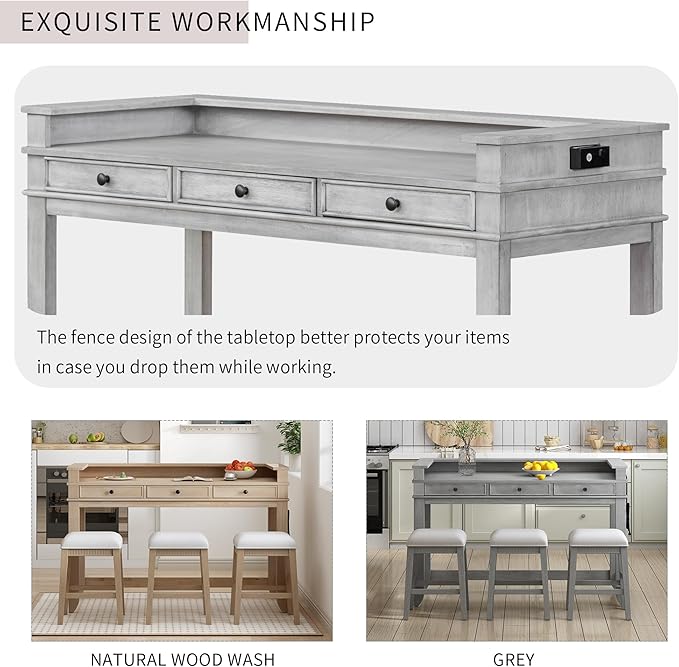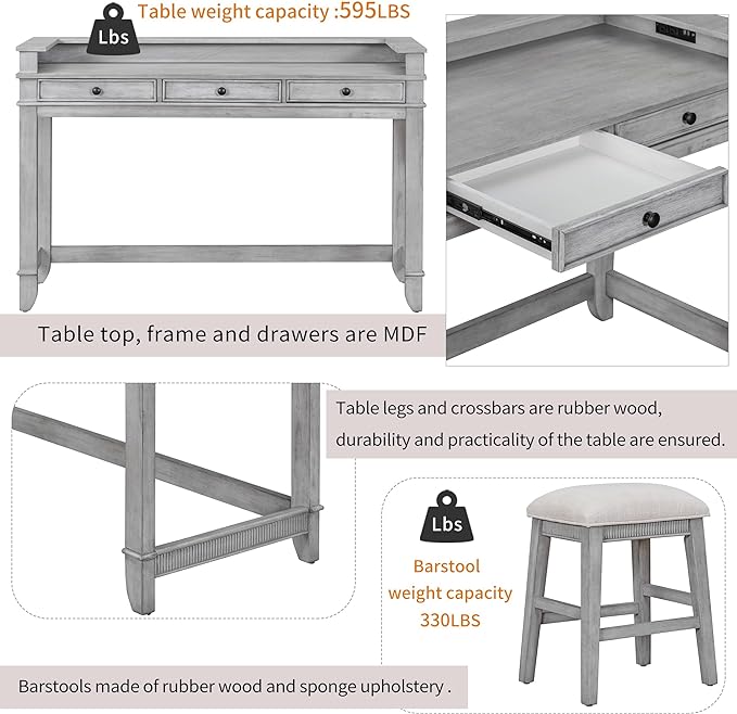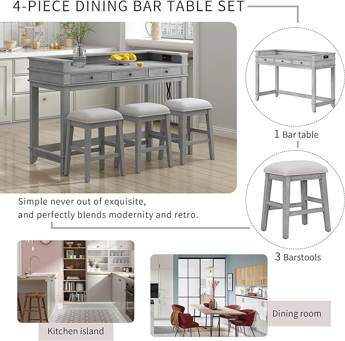 Retro Upholstered Stools, Multifunctional 3 Drawers, Easy Assembly and Clean, Room, Kitchen, Bar, Gray, 4 Piece Dining Table Set