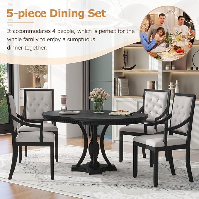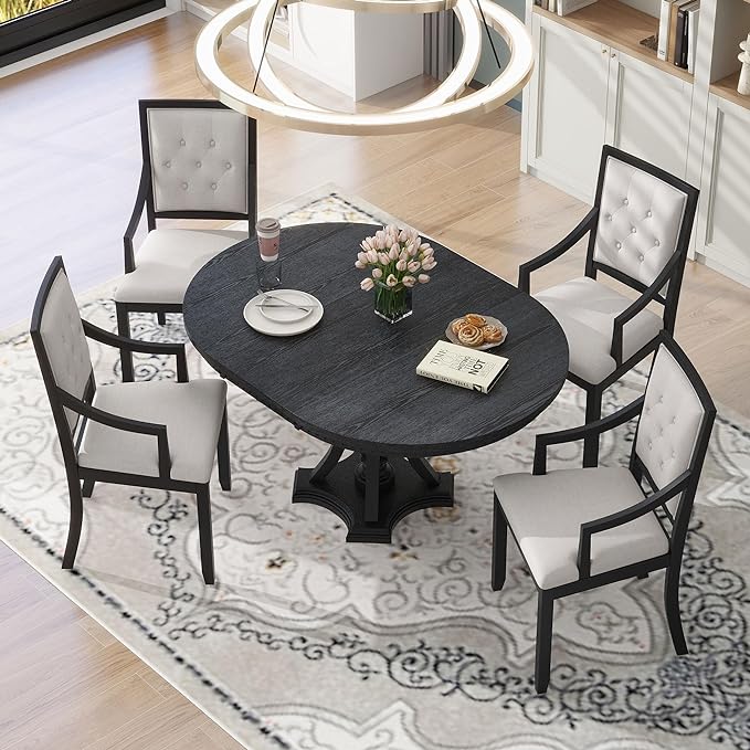 Retro Style 5 Piece Set with Extendable Freely AdjustableRound Table and 4 Chairs, Full Assembly Required and Easy Clean, for Dining Room, Kitchen, Oak, Black 19