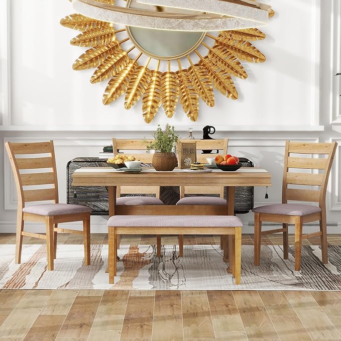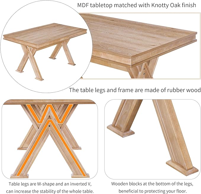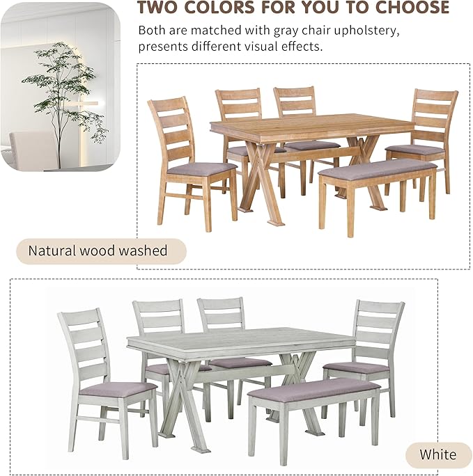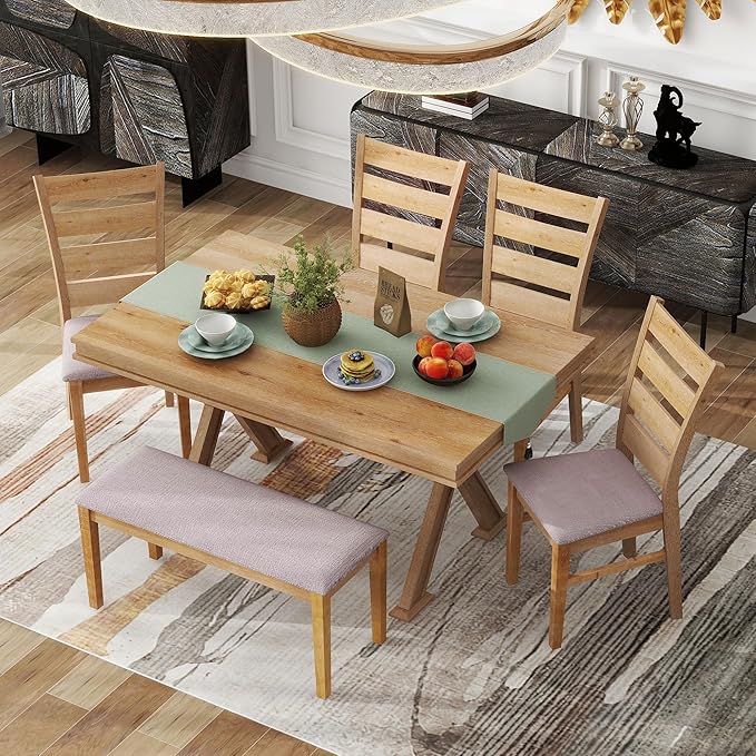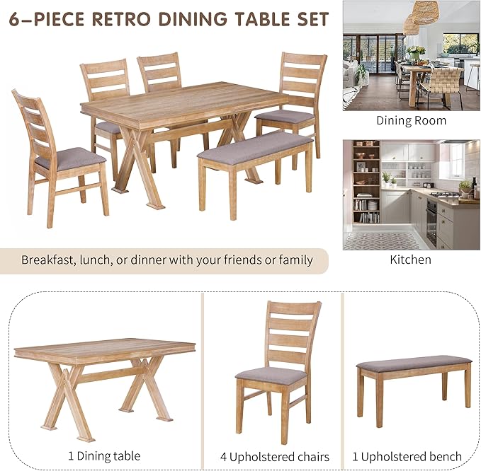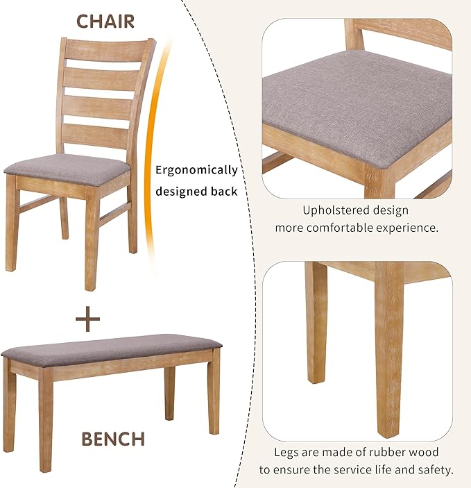 Retro 59" L Rectangular Unique Legs and 4 Upholstered Chairs & 1 Bench, Rubber, Easy Assembly, for Kitchen, Room, 6 Piece Dining Table Set, Natural Wood Wash 11