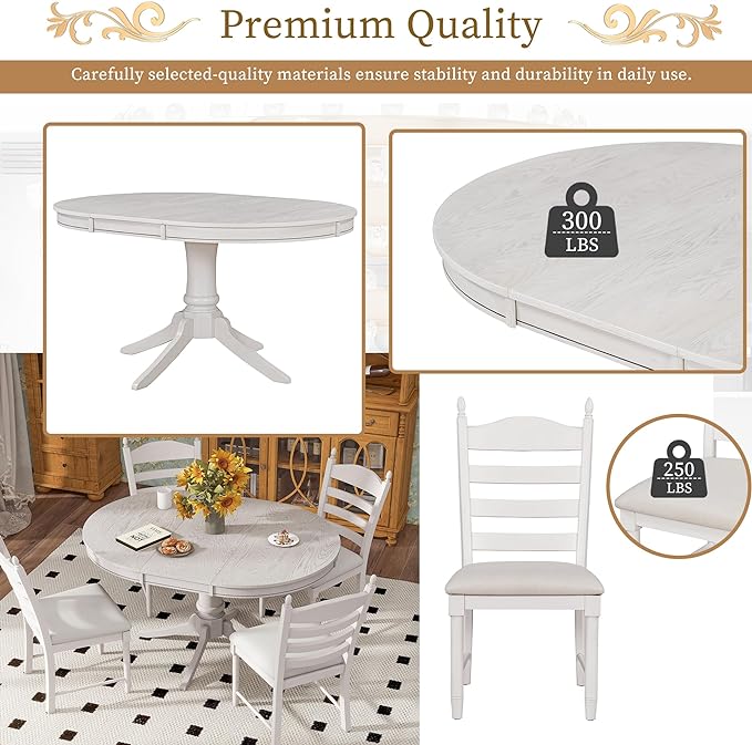 Wood Retro Functional Round Extendable 4 Upholstered Chairs, Easy Assembly and Clean, for Kitchen, Room, Antique White, 5 Piece Dining Table Set