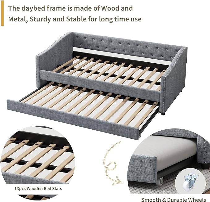 About This Linen Fabric 【Upholstered Daybed】Elegant style upholstered in soft and breathable linen fabric,feature a button tufted backrest and high...