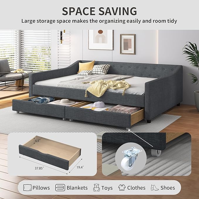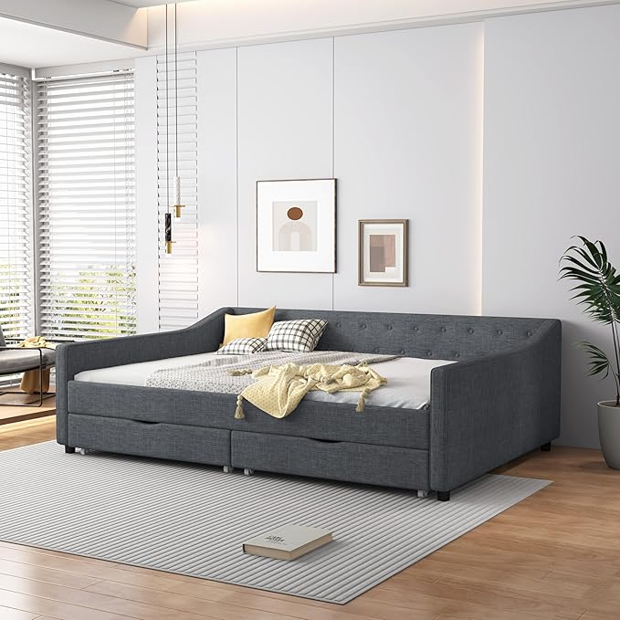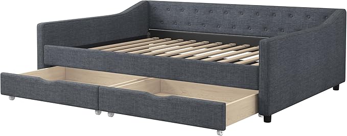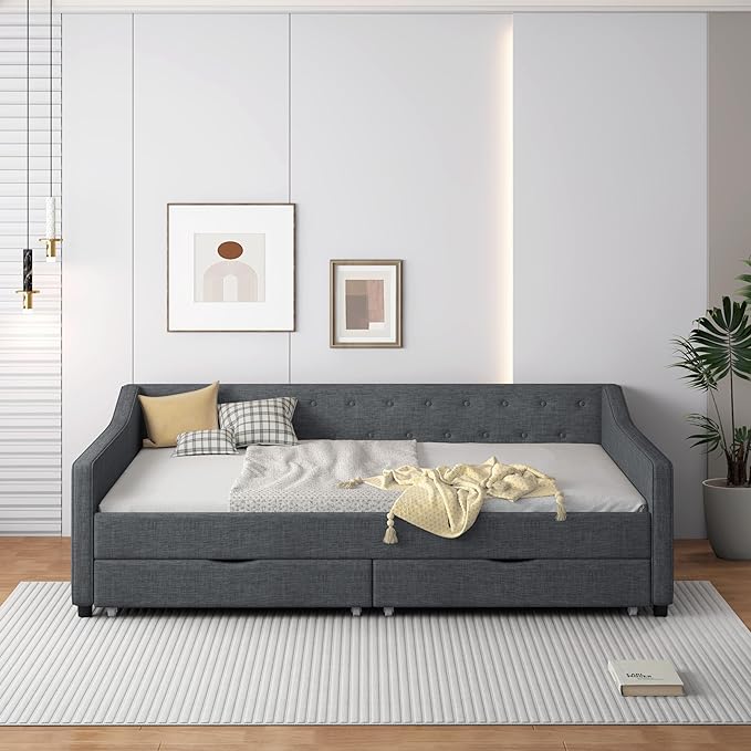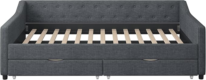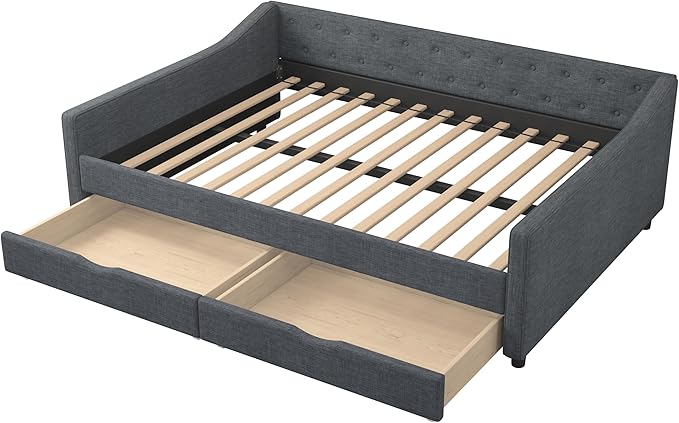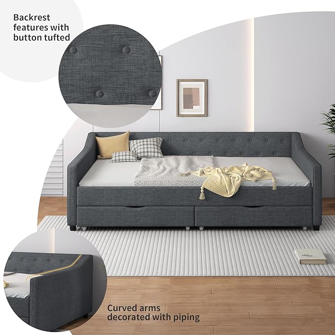 Full Size Upholstered Daybed with 2 Drawers,Wood Sofa Bed Frame W/Button Tufted Backrest and Waved Shape Arms,Slats Support,Linen Fabric Day Bed,for Bedroom,Living Room,Apartment,Dark Gray