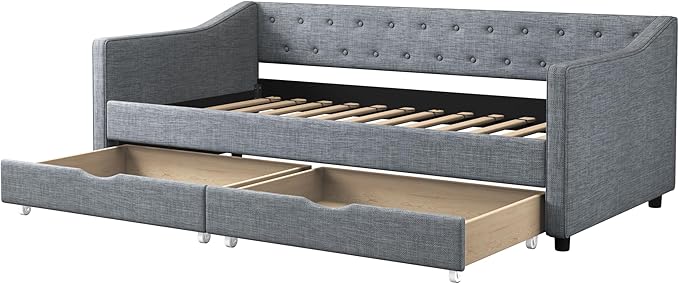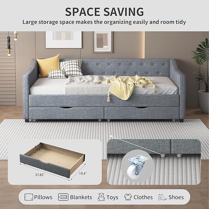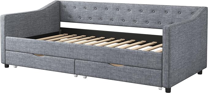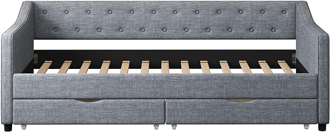 Twin Size Upholstered Daybed with 2 Drawers,Wood Sofa Bed Frame W/Button Tufted Backrest and Waved Shape Arms,Slats Support,Linen Fabric Day Bed,for Bedroom,Living Room,Apartment,Light Gray
