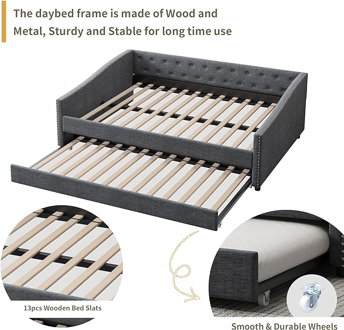 Full Size Upholstered Daybed with Twin Size Trundle,Wood Sofa Bed Frame W/Button Tufted Back and Nailhead Decorated Waved Shape Arms,Slat Support,for Bedroom,Living Room,Apartment,Dark Gray