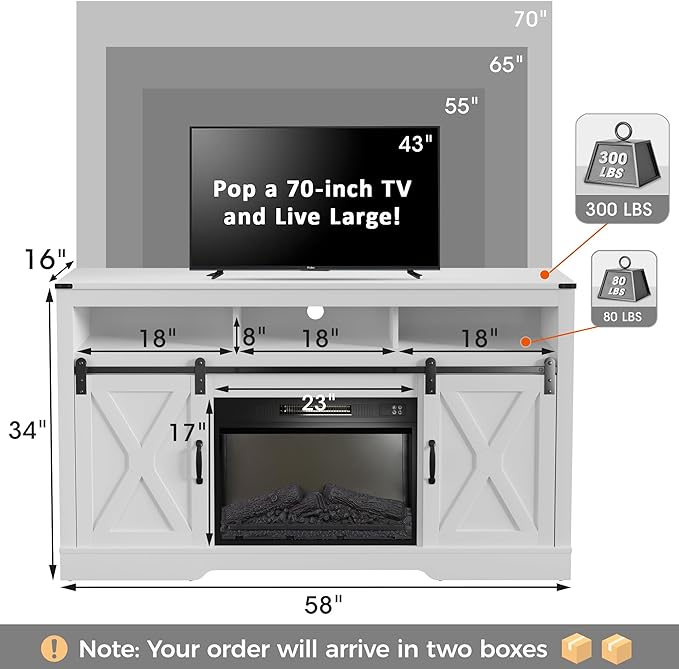 Farmhouse Fireplace TV Stand for 65+ Inch TV, Entertainment Center with 23" Electric Fireplace with Remote, Modern Rustic TV Console with Sliding Bar Door for Living Room, White