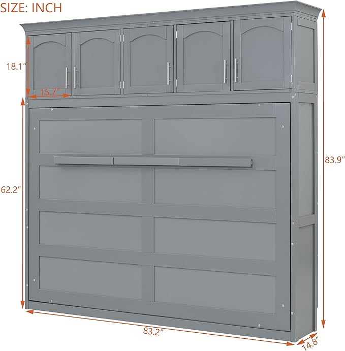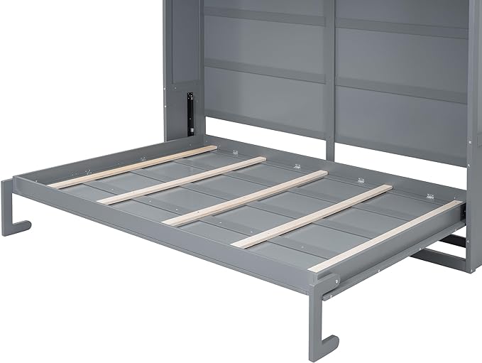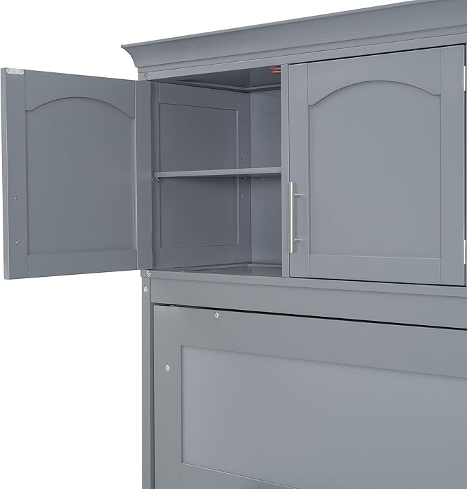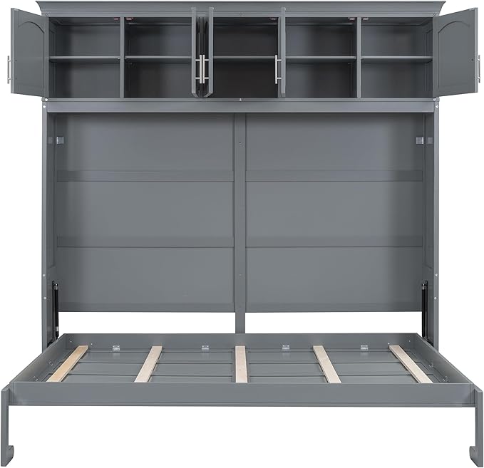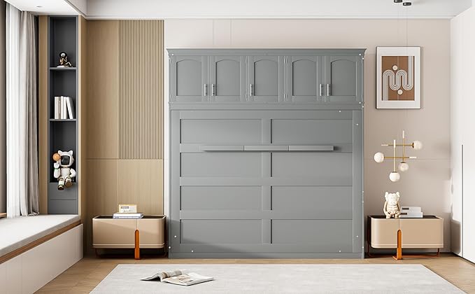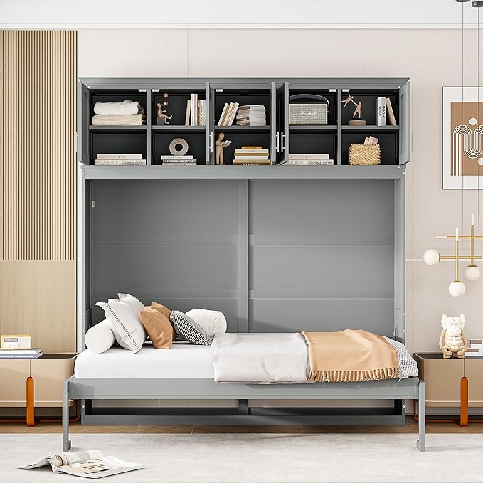Merax Modern Murphy Cabinet Bed with Top Cabinets, Solid Wood Wall Platform Bed/No Box Spring Needed/Easy Assemble Full,Gray