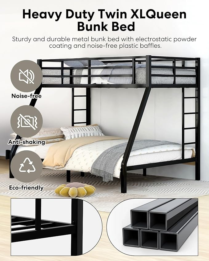 Metal Twin XL Over Queen Bunk Bed, Heavy Duty Twin XL Bunk Bed with 2 Safety Side Ladder and Full Length High Guardrail for Teens and Adults, Noise-Reduced