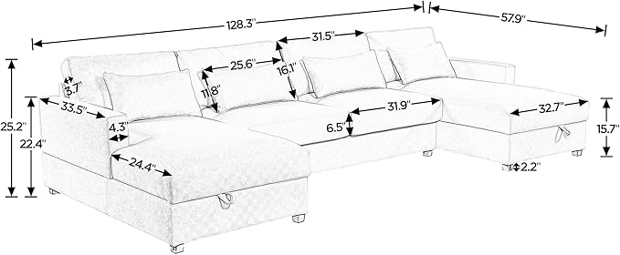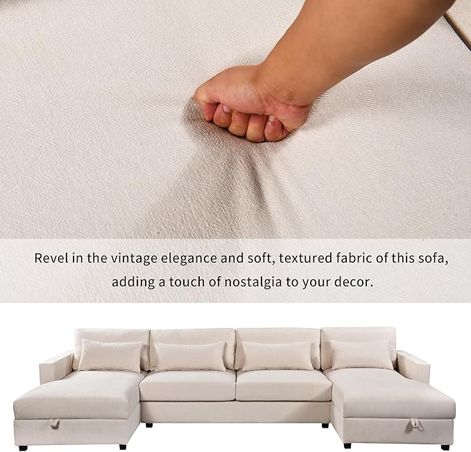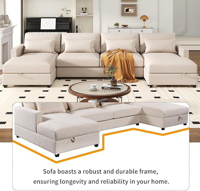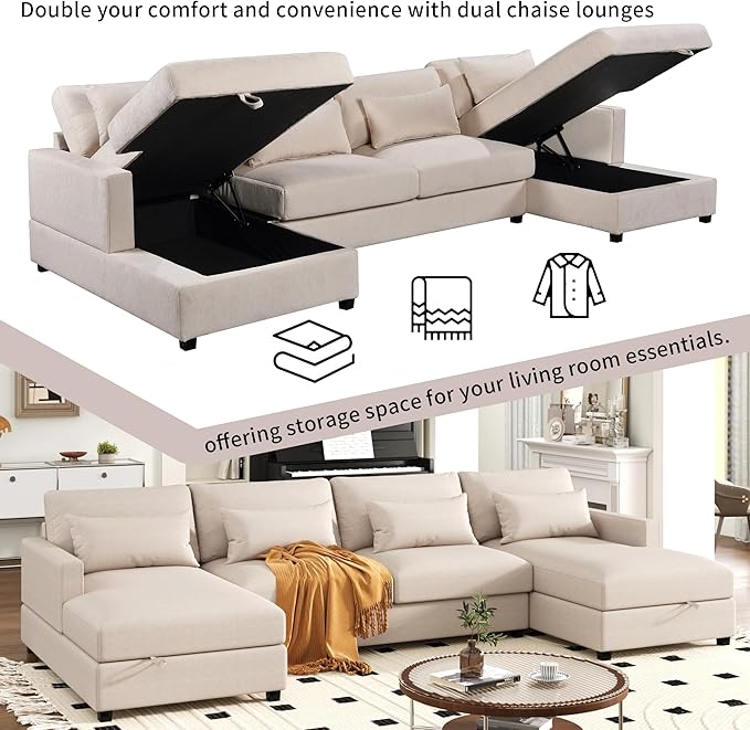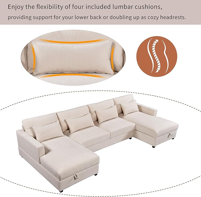 128.3" Modern Large U-Shaped Sectional Sofa with 2 Storage Chaise and 4 Lumbar Pillows, Oversized Reversible Upholstered Couch for Living Room, Apartment, Office, Beige, 128.3 Inch