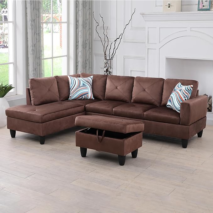 L-Shaped Sectional Couches with 66.5'' Chaise Lounge & Storage Ottoman Modular Room Sofas for Home Office Apartment, Large Living Furniture, 97'' Left Hand Facing, Brown Microfiber