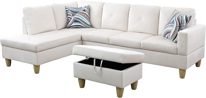 L-Shaped Sectional Couches with 66.5'' Chaise Lounge & Storage Ottoman Modular Room Sofas for Home Office Apartment, Large Living Furniture, 97'' Left Hand Facing, White Flannel
