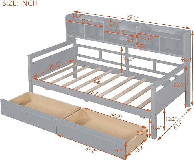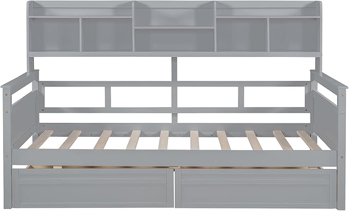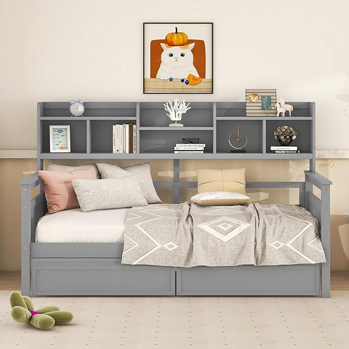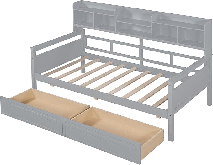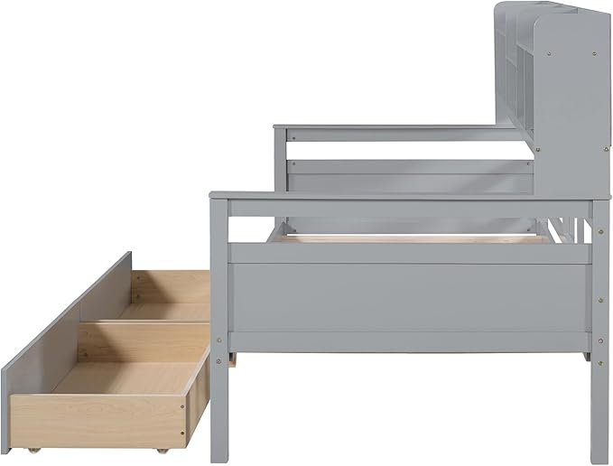 Merax Twin Wood Daybed with Bedside Shelves and Two Drawers Sofa Bed Frame for Kids Boys Girls/No Box Spring Needed Gray