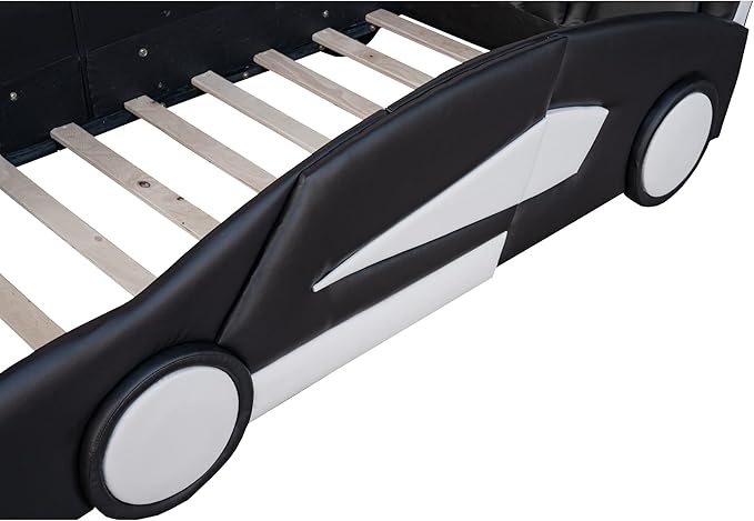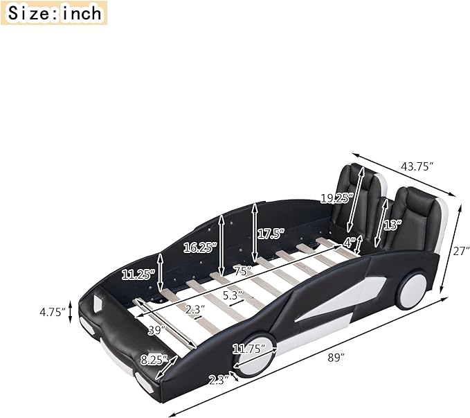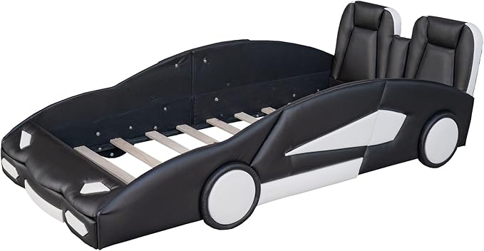 Twin Size Race Car Bed Platform Bed with Wheels and Side Rails,Bed Frame W/Two Seats Headboard,for Kids Boys Girls Teens,Black