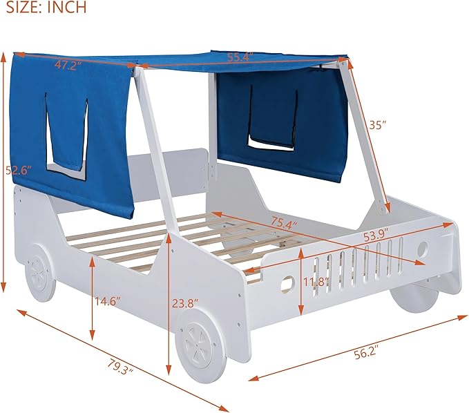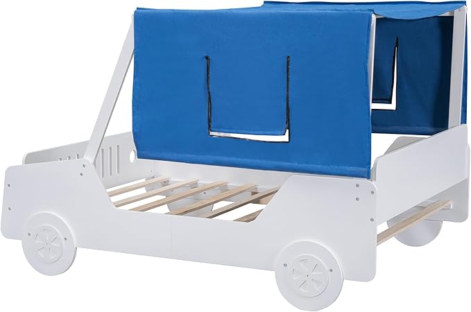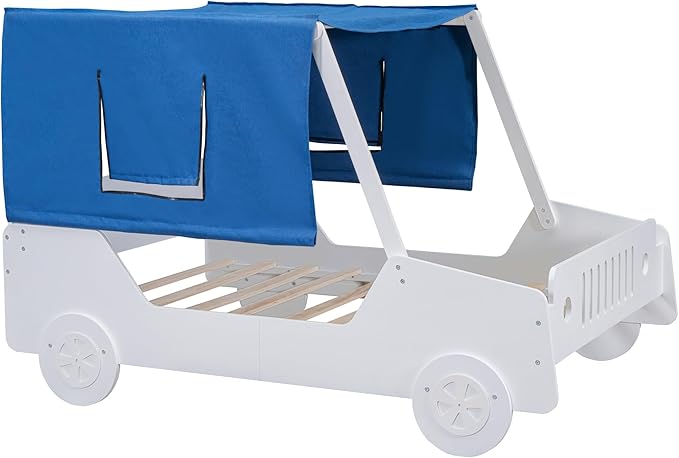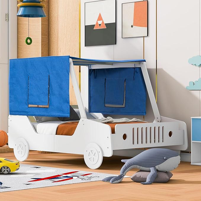 Twin Size Race Jeep Car Bed Platform Bed with Tent Canopy and Wheels,Wood Bed Frame W/Raised Bed Design,for Kids Boys Girls Teens,Natural