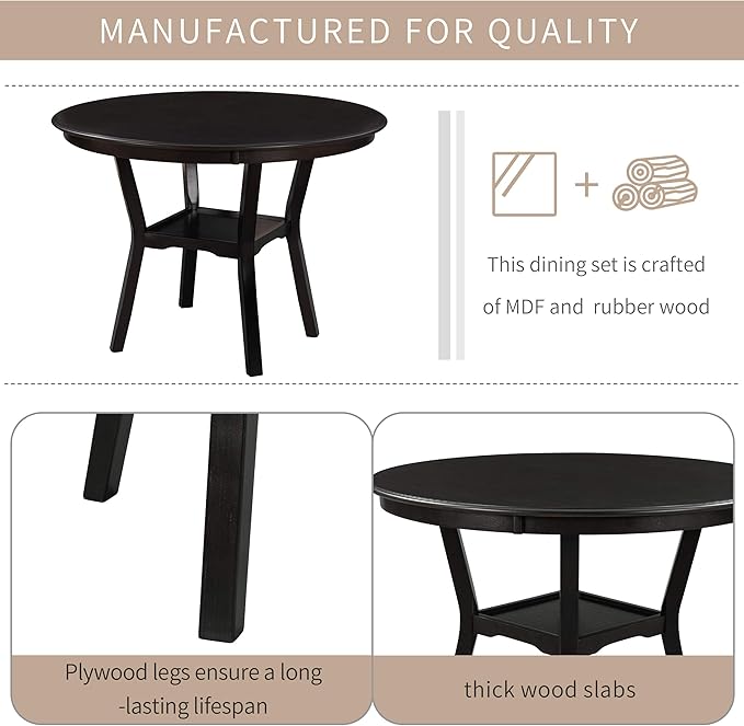 5-Piece Round Dining Table Set with Bottom Shelf and 4 Upholstered Chairs for Kitchen, Breakfast Nook, Living Room, Espresso, 42" L x 42" W x 30" H